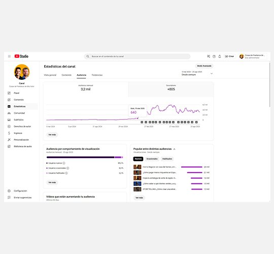 El punto de partida exigía rediseñar por completo la estrategia del canal. El contenido estaba bien pensado a nivel profesional, pero no estaba estructurado ni optimizado para ganar en descubrimiento, visibilidad, posicionamiento, ni en retención. El volumen de datos que teníamos disponible en YouTube Studio era mínimo para que el algoritmo considerara el canal como una fuente interesante.